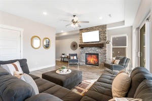 Our home's open concept is perfect for family and friends to reunite for relaxation. Step inside and be greeted by the main level's inviting atmosphere and fully equipped kitchen. Enjoy the peaceful sunrise with fresh coffee from the complimentary coffee bar featuring a standard drip pot and a Keurig available for your morning brew. The dining area offers comfortable seating for 12, including a spacious table for eight, complemented by four bar chairs for additional seating. Spread out in the oversized living area featuring a great conversation area with two full-size sofas to get caught up with friends and family or cozy up to the fireplace on our super comfortable sectional and enjoy a movie night on the large flatscreen TV. Open the patio doors off the sitting area and living room to reveal a spacious patio with stunning views of Table Rock Lake. Here, you'll find a private hot tub, fire pit, outdoor seating, and a propane grill, perfect for al fresco cooking, dining, and relaxation.