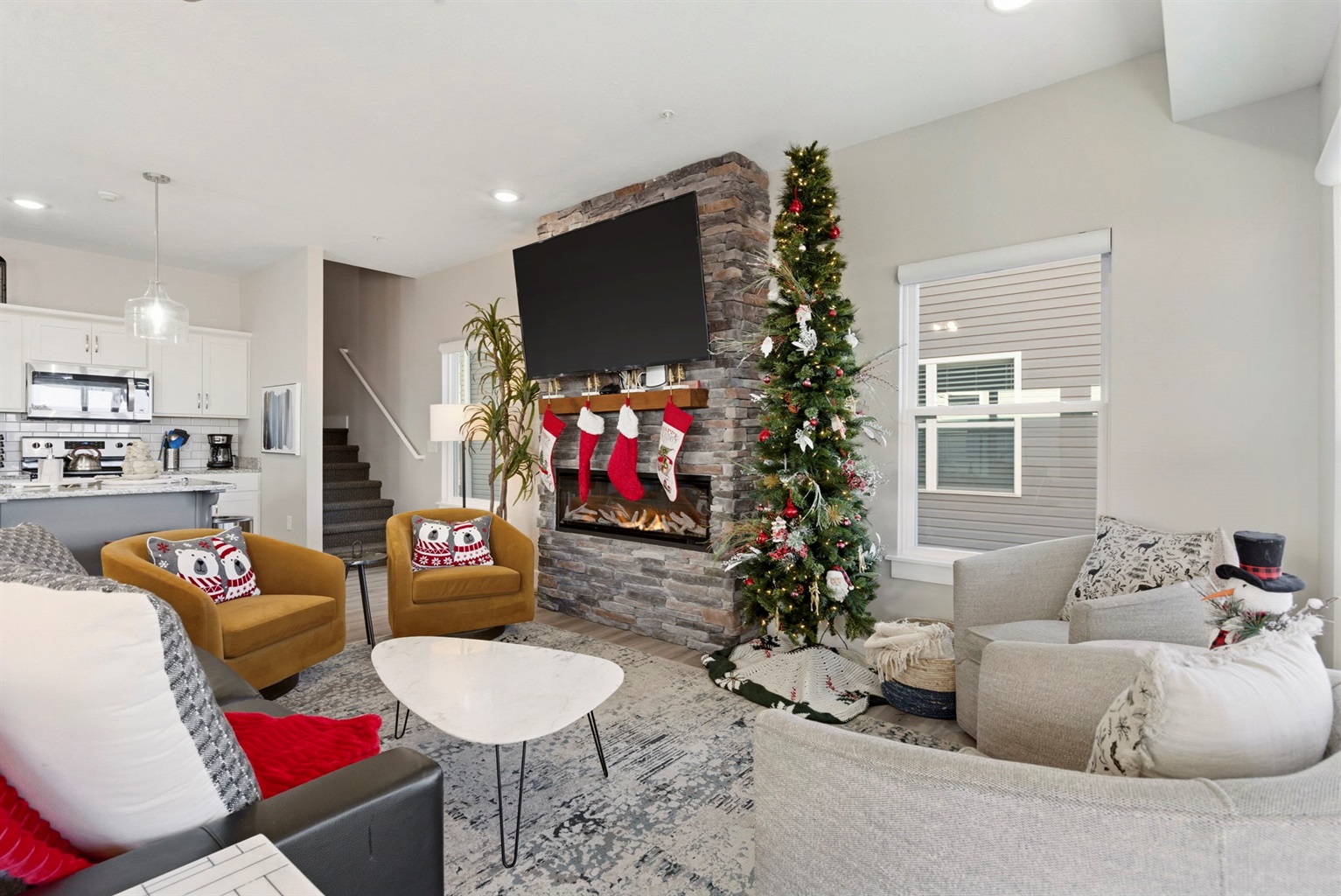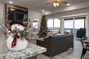 Our main living room features vaulted ceilings and expansive windows, comfortable seating, and custom blinds. Enjoy the cozy fireplace and a 65" smart TV. The living room also features a sofa sleeper with a queen sized bed if needed.