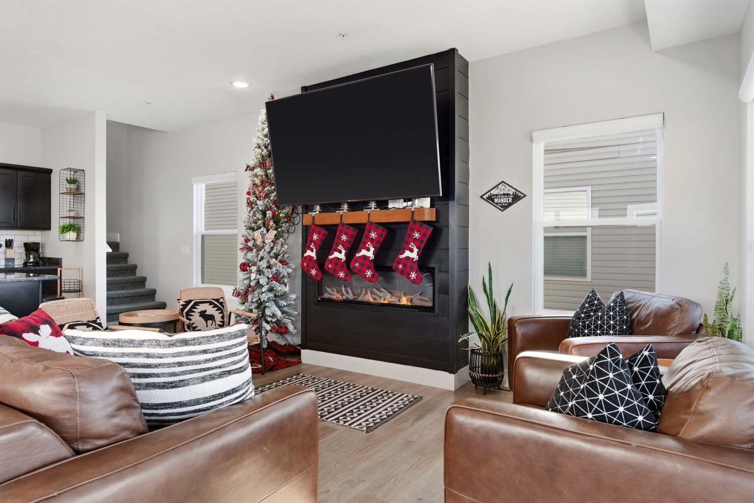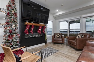Our main living room features vaulted ceilings and expansive windows, comfortable seating, and custom blinds. Enjoy the cozy fireplace and a 75" smart TV. The living room also features a sofa sleeper with a queen sized bed if needed.